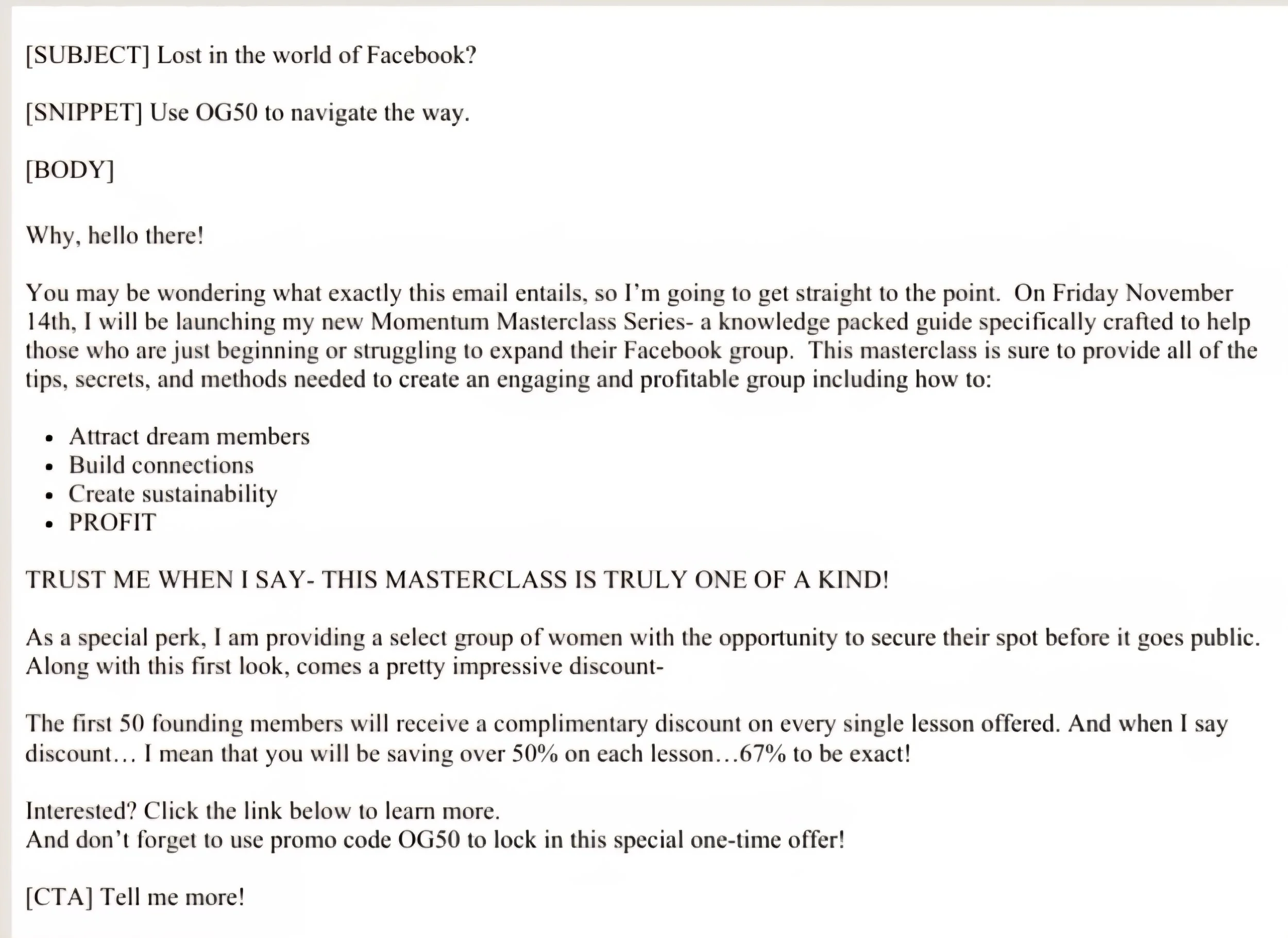 The email was designed as an early pre-launch introduction, positioning the masterclass as a practical solution for entrepreneurs looking to grow profitable online communities. The messaging focused on clearly communicating the program’s benefits while rewarding loyal subscribers with an exclusive early-member discount, creating both value and urgency.